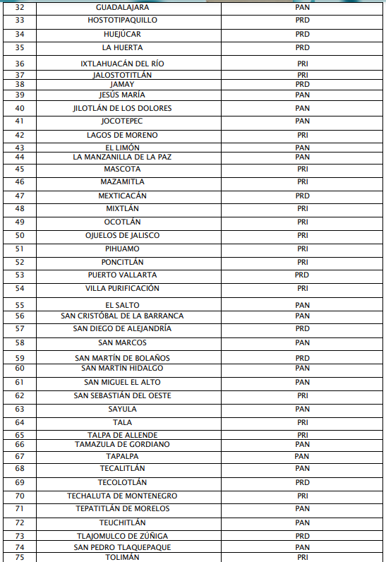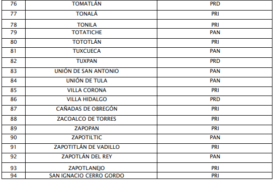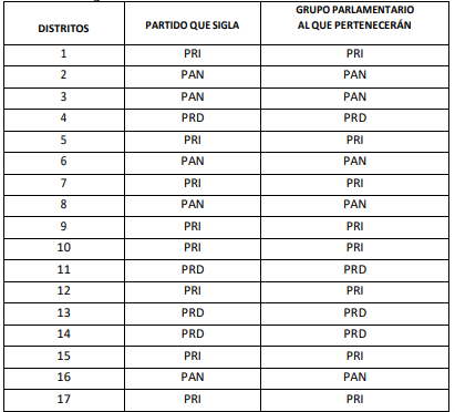 En el caso de la elección para diputaciones por el principio de mayoría relativa, para esta misma solicitud de convenio de coalición parcial de la denominada Fuerza y Corazón por Jalisco en los 20 distritos de la entidad, se aprobó de la manera siguiente:
