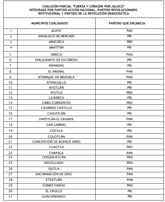 Convenio de coalición parcial de la denominada Fuerza y Corazón por Jalisco integrada por los partidos políticos nacionales: Partido Acción Nacional (PAN), Partido Revolucionario Institucional (PRI) y Partido de la Revolución Democrática (PRD) para contender en 94 municipios: