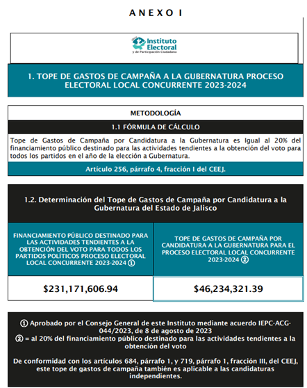 El Consejo General del IEPC Jalisco aprobó en la octava sesión ordinaria los montos de los topes de gastos de campaña para los partidos políticos, las coaliciones y sus candidaturas, así como de las candidaturas independientes, relativos al Proceso Electoral Local Concurrente 2023- 2024, quedando de la manera siguiente: