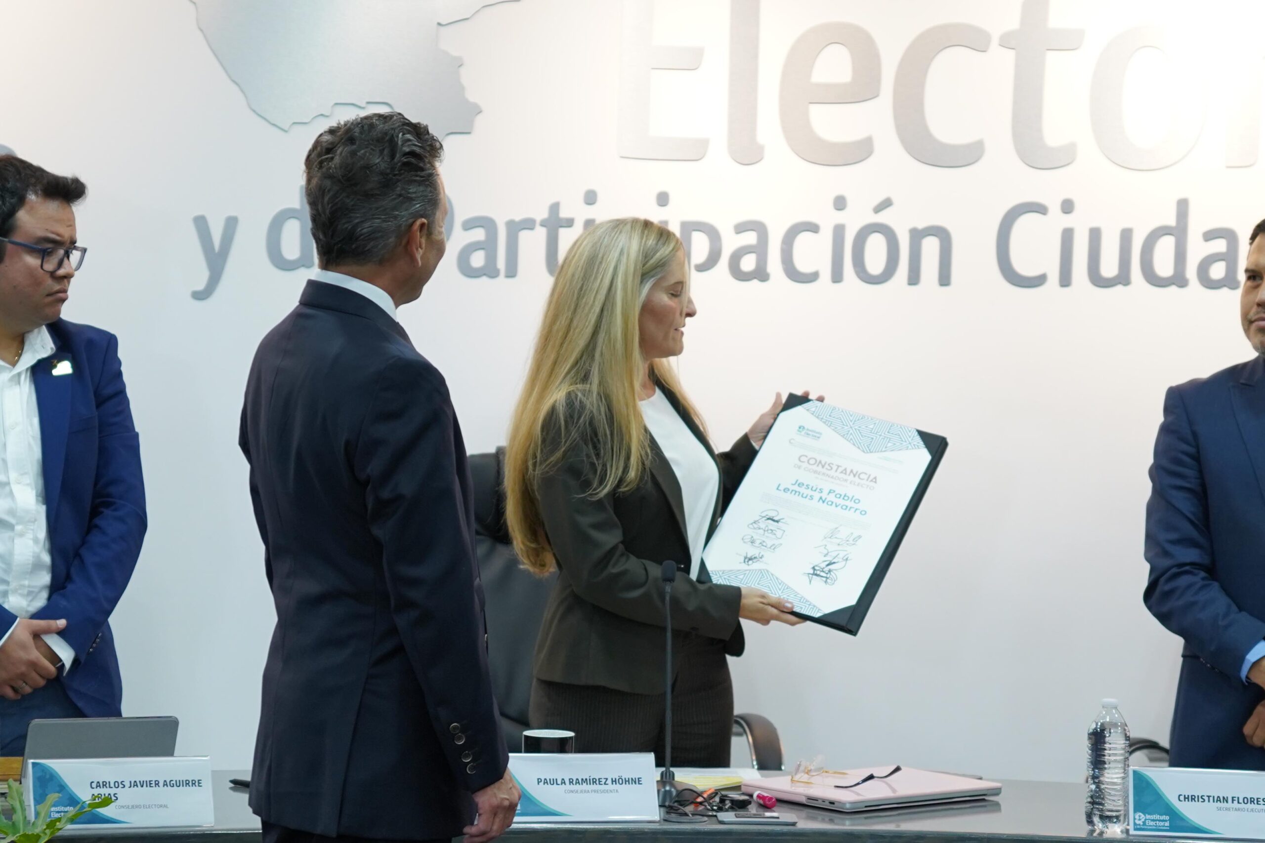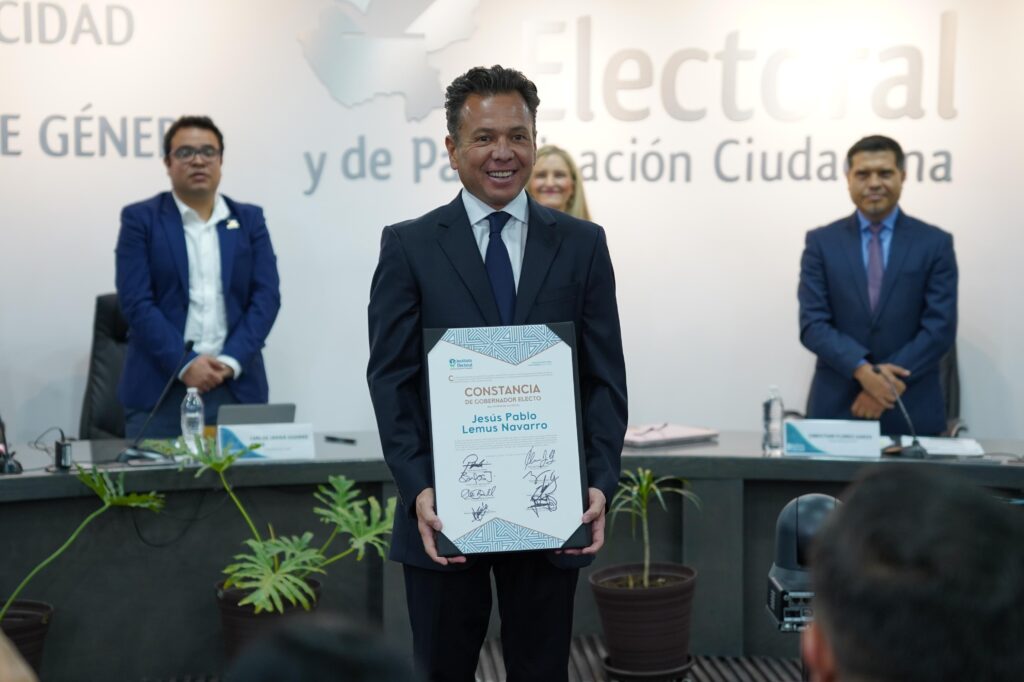En la Vigésima Novena Sesión Extraordinaria del Consejo General (CG) del Instituto Electoral y de Participación Ciudadana del Estado de Jalisco (IEPC), quien fuera presentado como candidato del partido Movimiento Ciudadano (MC) a la gubernatura del estado, el ciudadano Jesús Pablo Lemus Navarro, recibió la constancia de gobernador constitucional electo del estado libre y soberano de Jalisco, para el periodo del 6 de diciembre de 2024 al 5 de diciembre de 2030.