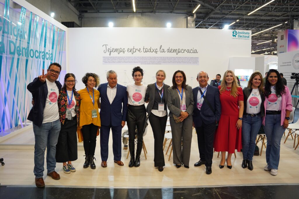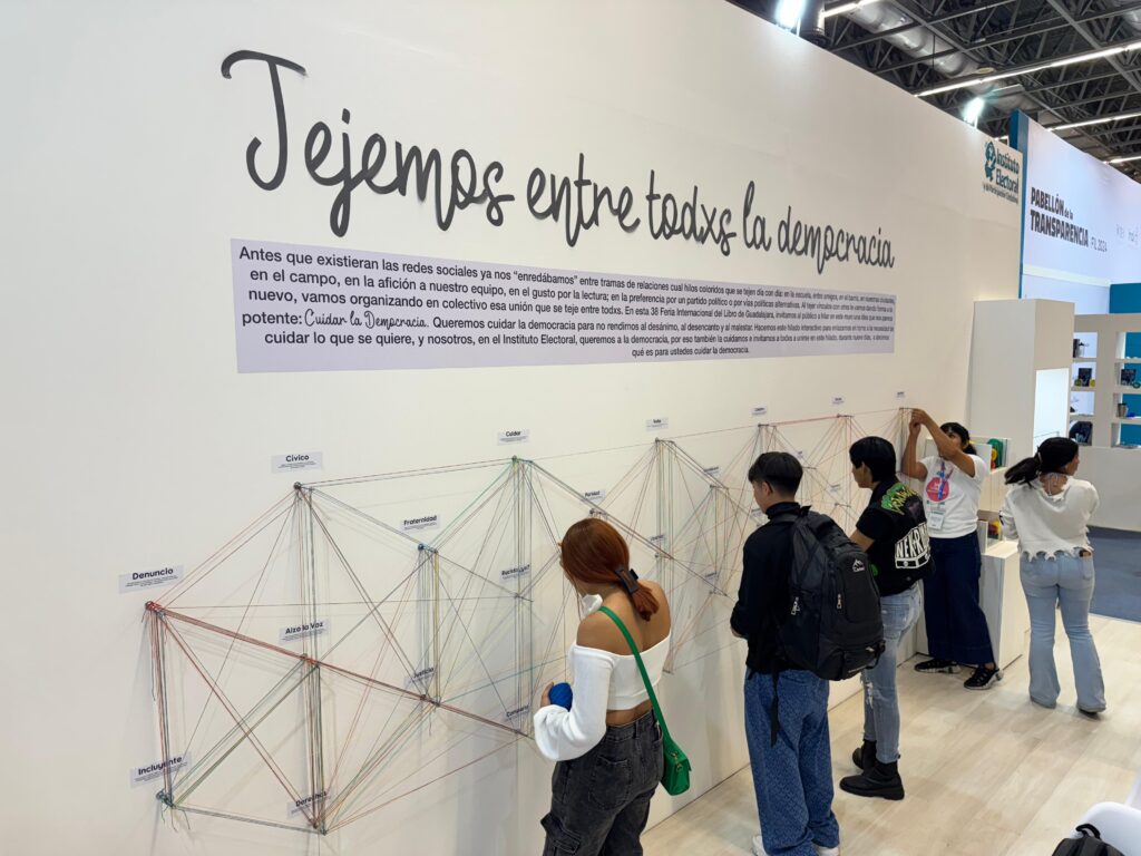 Por su parte, el Consejero Electoral, Carlos Javier Aguirre Arias, mencionó que esta edición el stand presenta un muro participativo de tejido con hilos de colores, que actúa como una metáfora del cuidado y fortalecimiento de la democracia. Los visitantes al stand tienen la oportunidad de involucrarse activamente al tejer con sus manos madejas de hilos, uniendo distintos puntos que representan los diversos significados que conforman nuestra sociedad. De esta manera, el acto de tejer se convierte en un símbolo de unión y de la interconexión de todos los elementos que conforman el sistema democrático en el que vivimos.
