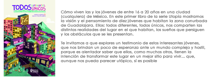 Presentamos nuestro primer número de la serie “Utopía”, con el tema de la igualdad y la no discriminación “Todos diferentes, todos únicos” nos habla de diez jóvenes de Jalisco y cómo perciben su entorno, las oportunidades que tienen y los obstáculos, en un mundo en donde todos pensamos distinto. Participa en las lecturas en vivo de este libro, todos los días a las 17:00 hrs. En el stand del Instituto Electoral.