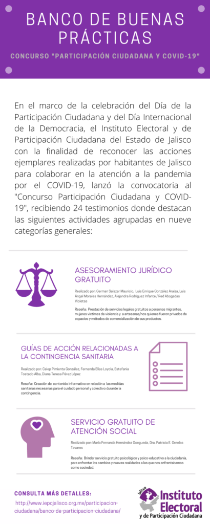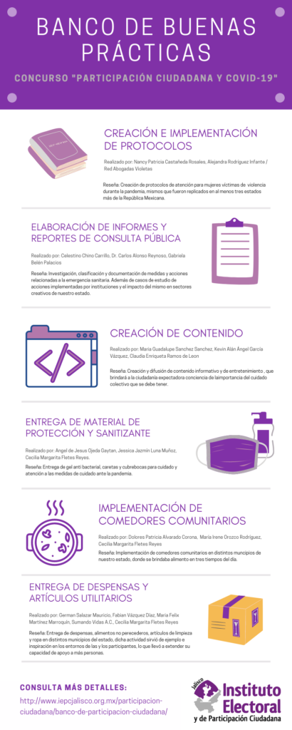 Derivado del concurso Participación Ciudadana y COVID organizado por el Instituto Electoral, se presenta la compilación de las prácticas que se sometieron a concurso por categorías en la siguientes infografías.
