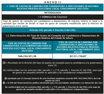 El Consejo General del IEPC Jalisco aprobó en la octava sesión ordinaria los montos de los topes de gastos de campaña para los partidos políticos, las coaliciones y sus candidaturas, así como de las candidaturas independientes, relativos al Proceso Electoral Local Concurrente 2023- 2024, quedando de la manera siguiente: