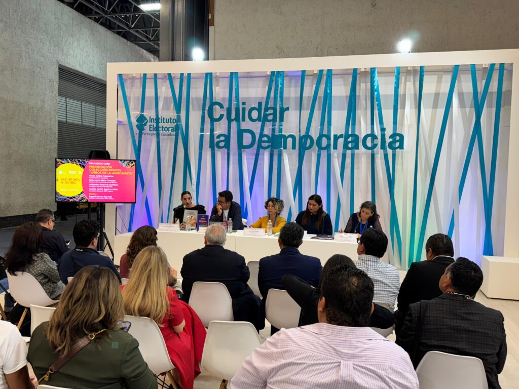 La presentación estuvo a cargo de las autoridades electorales de Nuevo León, la consejera electoral Alejandra Esquivel Quintero; Tessie Solinis Casparius, autora de libros infantiles, Sofía de la Mora Campos integrante del comité editorial del IEEPC Nuevo León, y los anfitriones Carlos Javier Aguirre, consejero electoral de Jalisco y Sayani Mozka Directora Editorial.