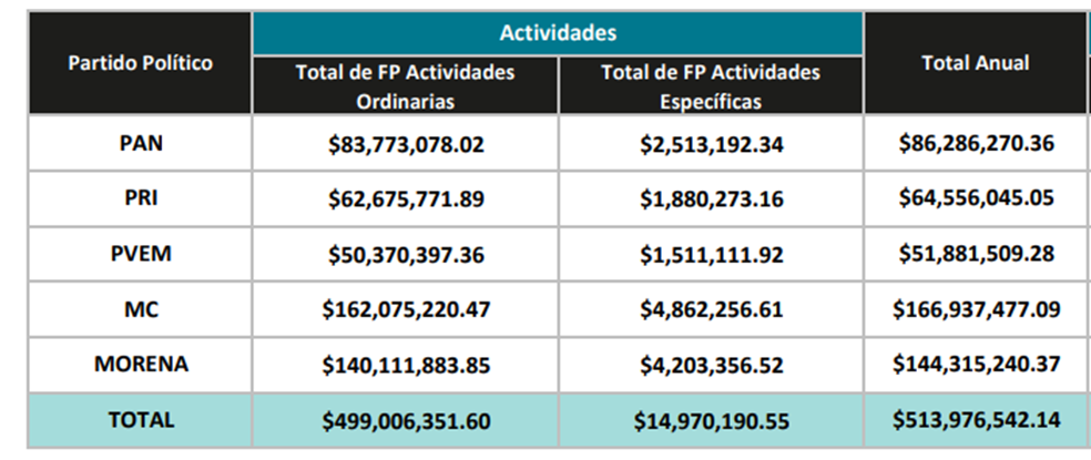 Las leyes prevén otorgar, adicionalmente, el 3% de ese monto a los partidos políticos, equivalente a 14 millones 970 mil 190 pesos, para que sean destinados a actividades específicas como la educación, capacitación, investigación, entre otras.