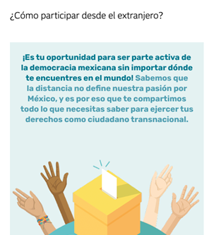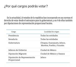 En la Ciudad de México, Durango, Guanajuato, Guerrero, Jalisco, Nayarit, Oaxaca, Tamaulipas y Zacatecas no solo se ha reconocido el derecho a votar de las personas residentes en el extranjero, sino también a ser votadas, es decir, a postularse para acceder a un cargo de representación política, a través de la figura conocida coloquialmente como «diputación migrante». Cada uno de estos estados tienen reglas y procedimientos diferentes. En el caso de Jalisco, los partidos políticos deberán postular al menos una fórmula para diputación local por mayoría relativa con personas jaliscienses en el extranjero; o bien, una candidatura en los primeros diez lugares de la lista de diputaciones por representación proporcional deberá ser para personas jaliscienses residentes en el extranjero. Podrás encontrar mayor información en la página Jalisco Vota Extranjero https://www.iepcjalisco.org.mx/JaliscoVotaExtranjero/.